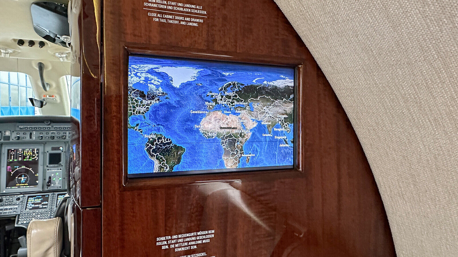 | Equipment | | Second FMS 3000, HF with SELCAL (provisions), CVR/FDR, TCAS II, EGPWS Mark VIII, upgraded AirStair, SATCOM, Jeppesen E-Charts (IFIS File Server), Multi-Scan Weather Radar, TCAS II, Mark VIII EGPWS, Cabin Display (Airshow) with 2 additional Screens, belted Toilet Seat with sliding Door, AC Power outlets. |