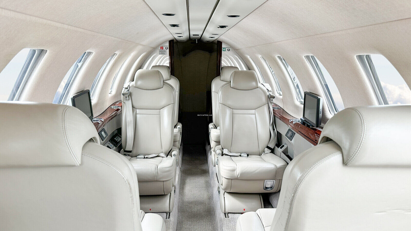 | Interior | | 2 Crew-, 4 Club Seats; 2 single fwd. Seats, double seat Divan (Couch) and belted Toilet Seat (max. 9 Pax), AC Power Outlets, Lavatory with sliding door for privacy, 2 additional foldable slimline Tables on seat 7 & 8, Satcom Telephone, Airshow with Media Center and 2 additional Table Screens, Hot Coffee Bar, electric Window shades. |