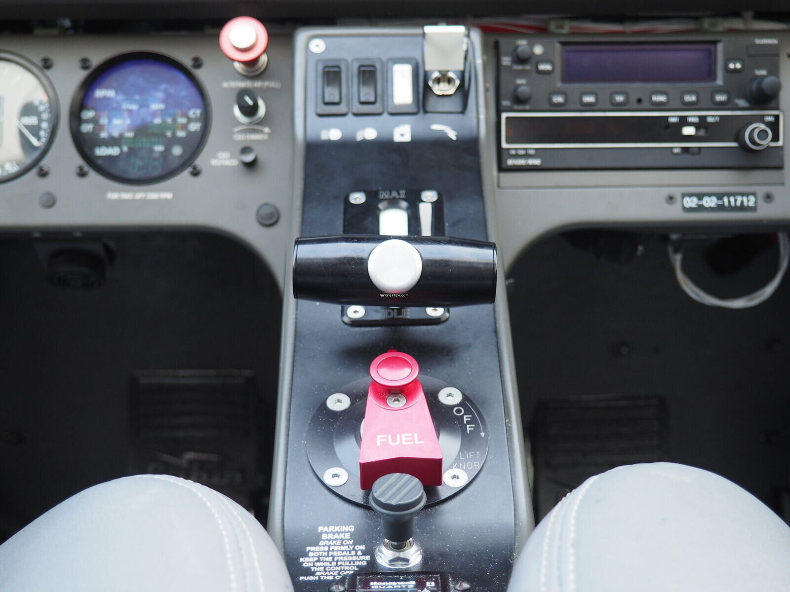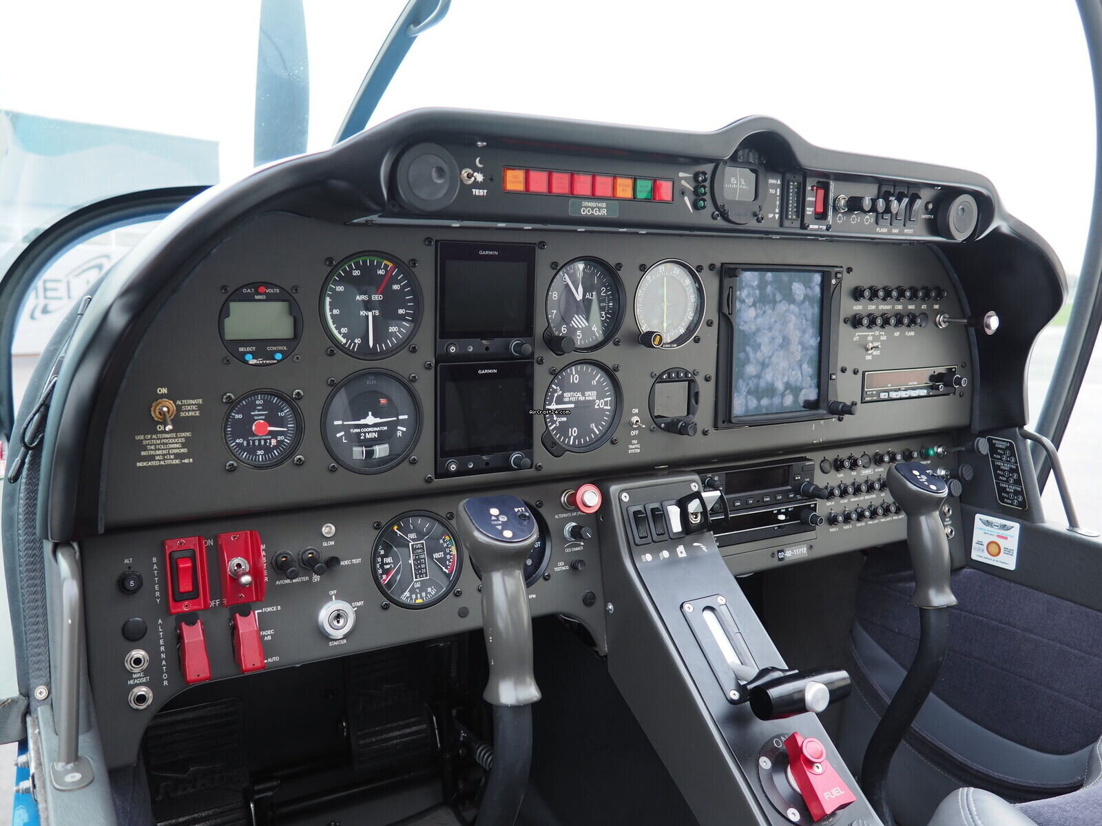| Interior | | The cabin of this Robin DR-400 is a testament to thoughtful ergonomics and premium materials, offering a spacious four-seat configuration that ensures comfort for both pilot and passengers. The interior features a striking slate-grey and charcoal upholstery design. The seats are finished in a durable, high-quality fabric with light grey synthetic leather accents for a modern, automotive-style feel. |